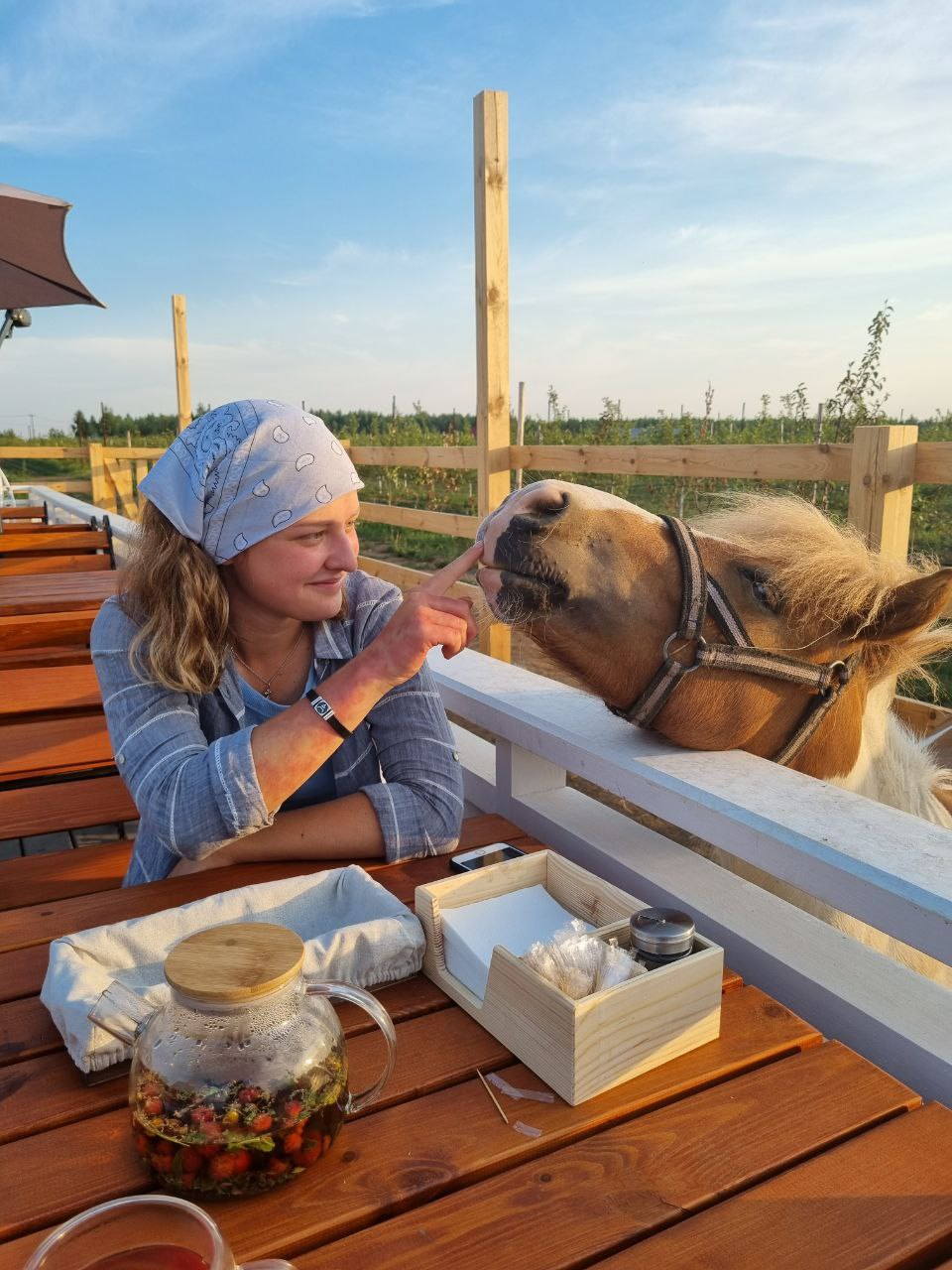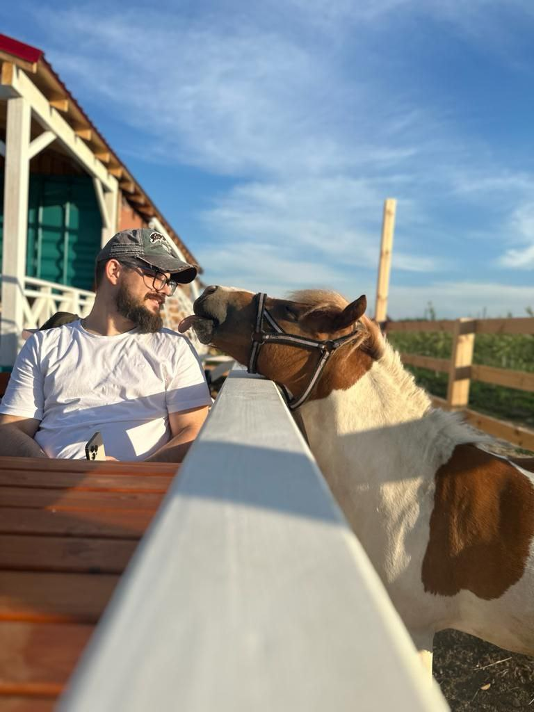 Прямо с террасы гости с удовольствием смогут покормить наших милых пони- Друшлак и Патисон. Они всегда в ожидании вкусняшек, которые тоже можно приобрести для лошадей.